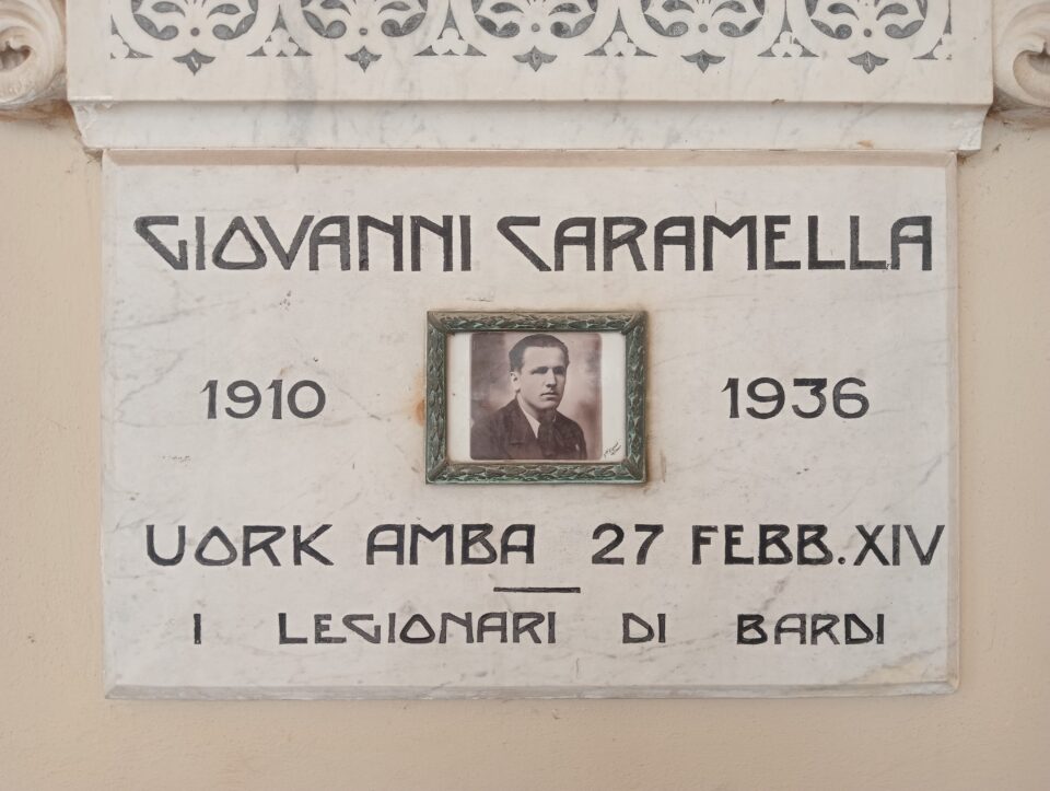 A Bardi, in via Pietro Cella, sotto al porticato che collega piazza Martiri d’Ungheria, si trova una bellissima targa dedicata da “i legionari di Bardi” a Giovanni Caramella, milite della 180° Legione “Farnese”, caduto durante la battaglia per la presa di Uork Amba, in Etiopia.